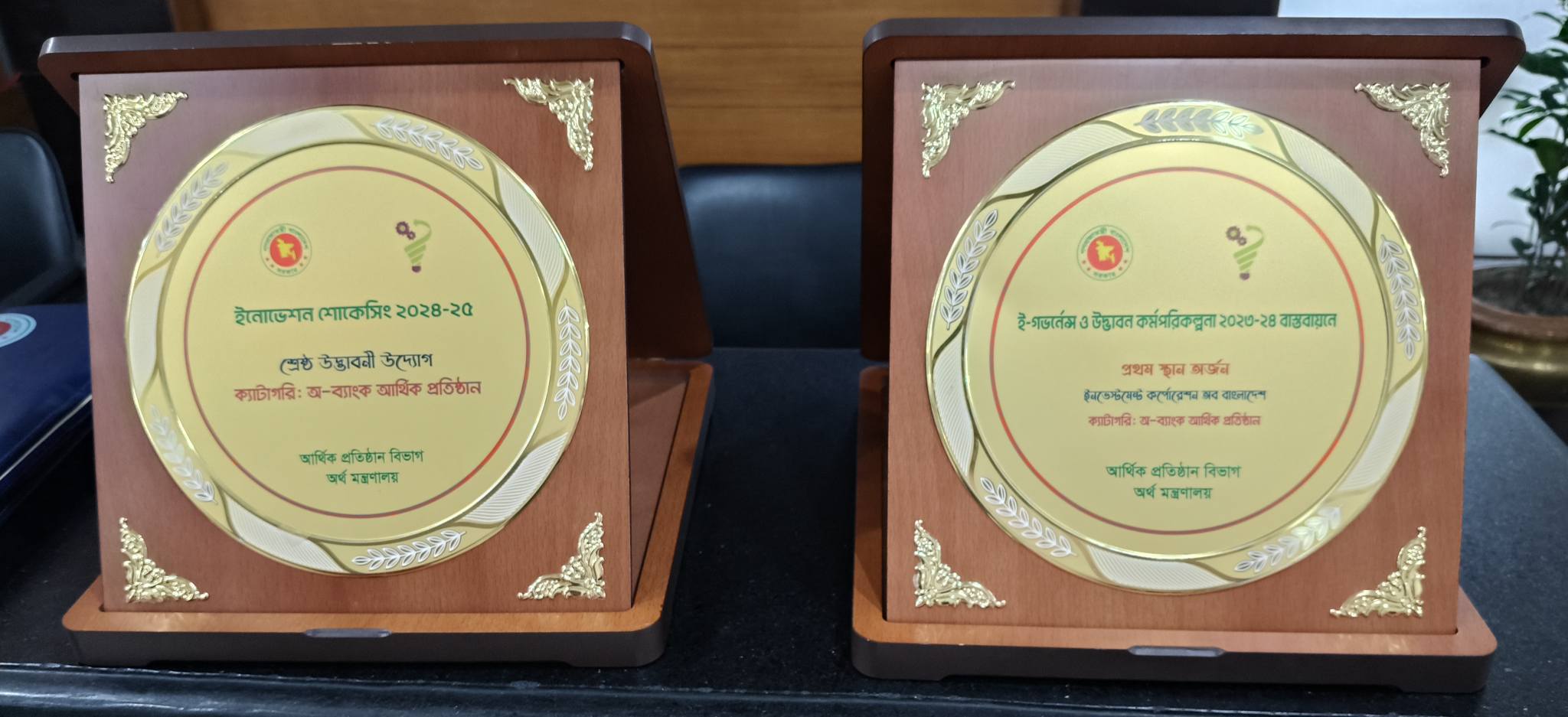 ইনোভেশন শোকেসিং ২০২৪-২০২৫ এ শ্রেষ্ঠ উদ্ভাবনী উদ্যোগ এবং ই-গভর্নেন্স ও উদ্ভাবন পরিকল্পনা ২০২৩-২৪ বাস্তবায়নে “অ-ব্যাংকিং আর্থিক প্রতিষ্ঠান” ক্যাটেগরিতে ইনভেস্টমেন্ট কর্পোরেশন অব বাংলাদেশ (আইসিবি) প্রথম স্থান অর্জন।